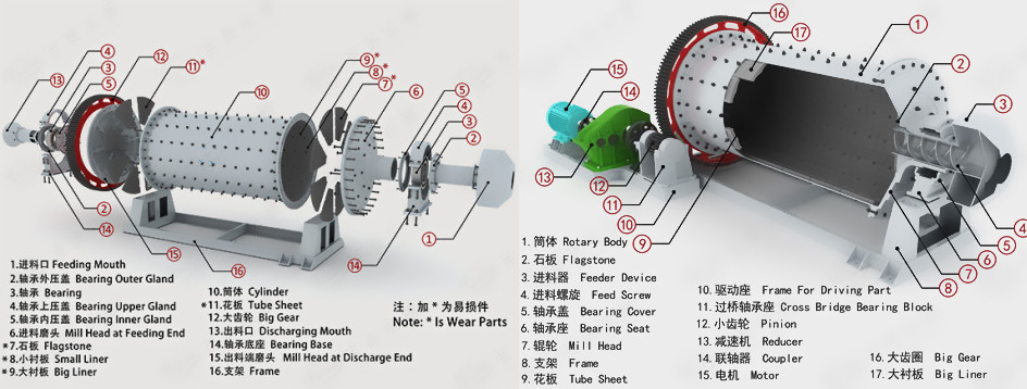 昆重礦機(jī)生產(chǎn)的濕式溢流型球磨機(jī)是由進(jìn)料器、出料器、軸承座、端蓋、法蘭盤、筒體、大齒輪、傳動總成(減速機(jī)、小齒輪、聯(lián)軸器、電機(jī))等部件組成。襯板采用13錳鋼耐磨料,具有耐磨及防腐特點。