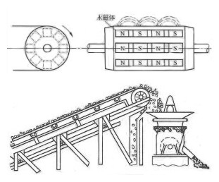 磁力滾筒又稱干磁輥,其結(jié)構(gòu)簡(jiǎn)單,可直接安裝在皮帶輸送機(jī)的頭部,也可以叫拋廢機(jī)。磁性物料隨皮帶移動(dòng)到滾筒頂部時(shí)即被吸附,轉(zhuǎn)到底部時(shí)自動(dòng)脫落,而非磁性物料沿水平拋物線軌跡直接落下。它可用于物料除鐵,特別是用于磁鐵礦塊礦預(yù)選,俗稱減石頭機(jī)。目前,是磁鐵礦選礦廠的主要選礦設(shè)備。