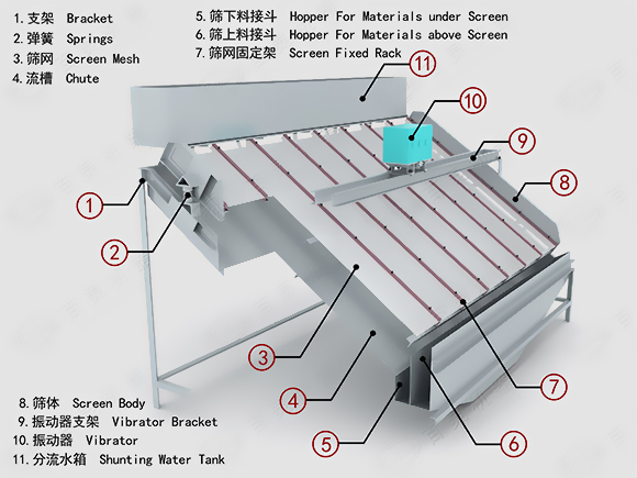 高頻篩采用了高頻率,一方面破壞了礦漿表面的張力和細粒物料在篩面上的高速振蕩,加速了大密度(比重)有用礦物和析離作用,增加了小于分離粒度物料與篩孔接觸的概率。從而造成了較好的分離條件,使小于分離粒度的物料,特別是比重大的物粒和礦漿一起透過篩孔成為篩下產物。